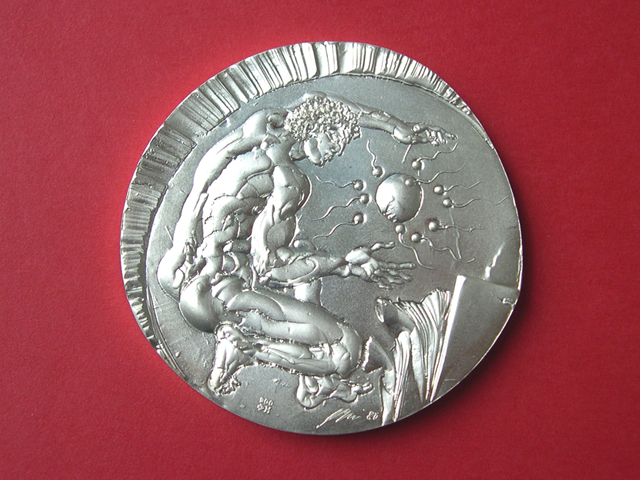 (M-12) Ehrenmedaille von Hans Erni zum Thema 125 Jahre Eidgenössische Technische Hochschule Zürich von 1980 "Technik - wozu und wohin?" Die Medaille weicht leicht von der üblichen kreisrunden Form ab. Kreativität - dargestellt durch einen Forscher (mit Eizelle und Spermien). Die Auflage ist nicht limitiert, mittlerweile wurden schätzungsweise mehr als 2'000 Medaillen als Auszeichnung für hervorragende Master- und Doktorarbeiten verliehen. Es wurden bisher keine Medaillen für Sammler geprägt.